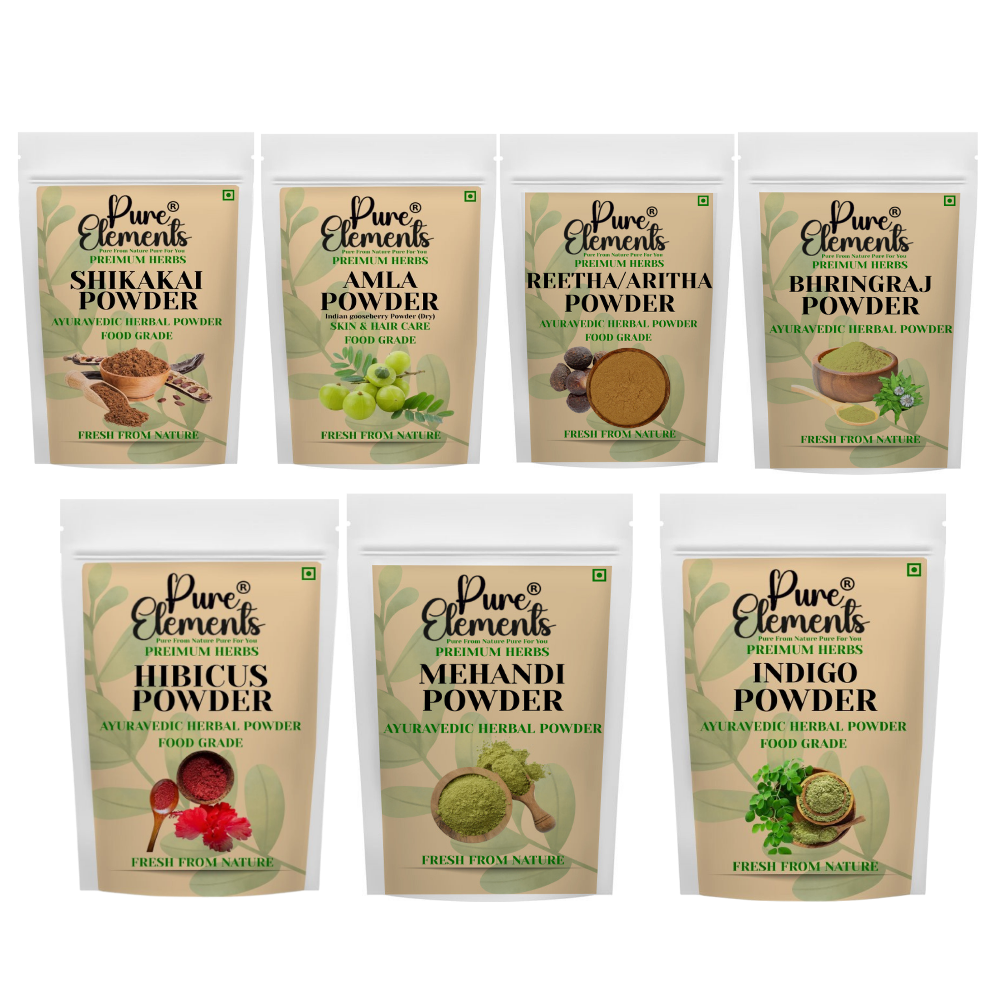Pure Elements Herbal Hair Care Combo | Shikakai, Amla, Reetha, Bhringraj, Hibiscus, Mehndi & Indigo Powders ( 100 gm Each )